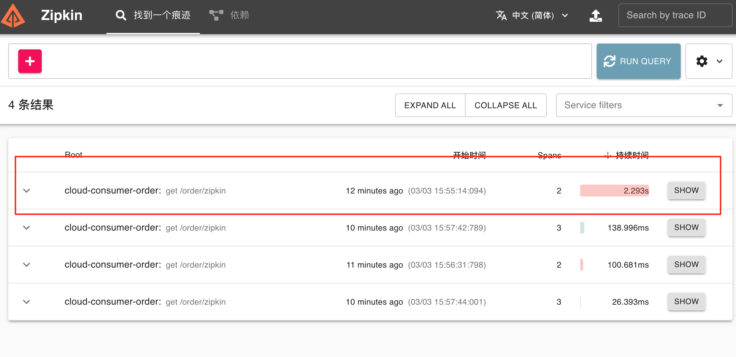localhost:9411查看zipkin服务调用链路,点击show按钮查看调用详情