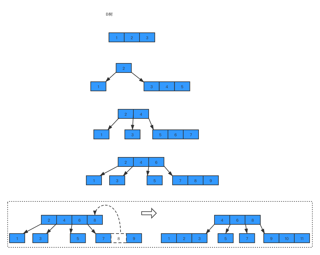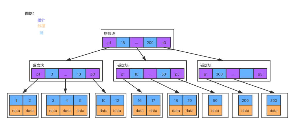 为了解决树结构深度过深的问题,引入B树。以上是一个4阶B树,每个节点最多存储3个数据。随着B树阶数的增加,同样层数保存的数据量急剧增加。