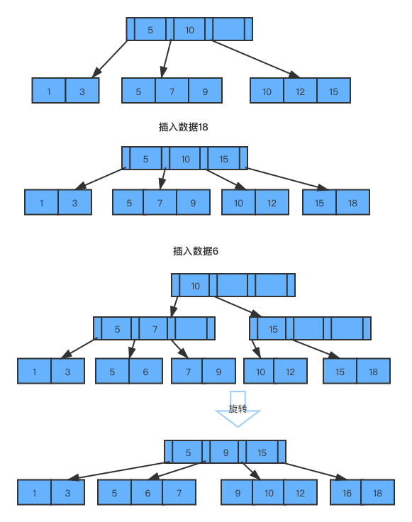B树的不足:非叶节点也需要保存数据,而数据库中的数据占用内存一般都比索引更大,相比B+树,同样数据量下,非叶节点都用来存储索引,数据都在叶节点中保存,则树的层数减少,能较少更多的io次数,提高性能。