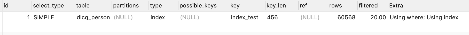 Extra--Using where:使用where条件查询,Using index:索引覆盖,Using filesort:使用当前文件排序(尽量不要出现,不出现时使用索引排序)
