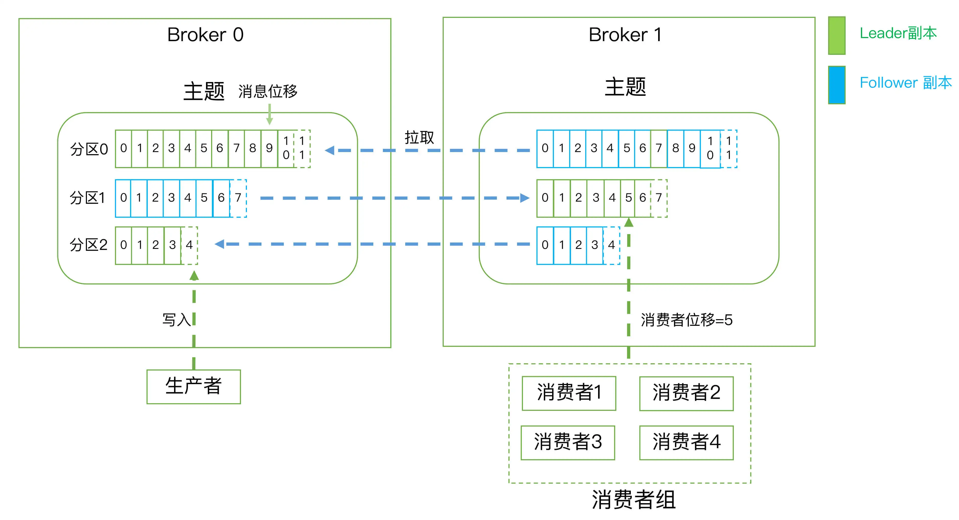 - 消费者位移:Consumer Offset。表征消费者消费进度,每个消费者都有自己的消费者位移。